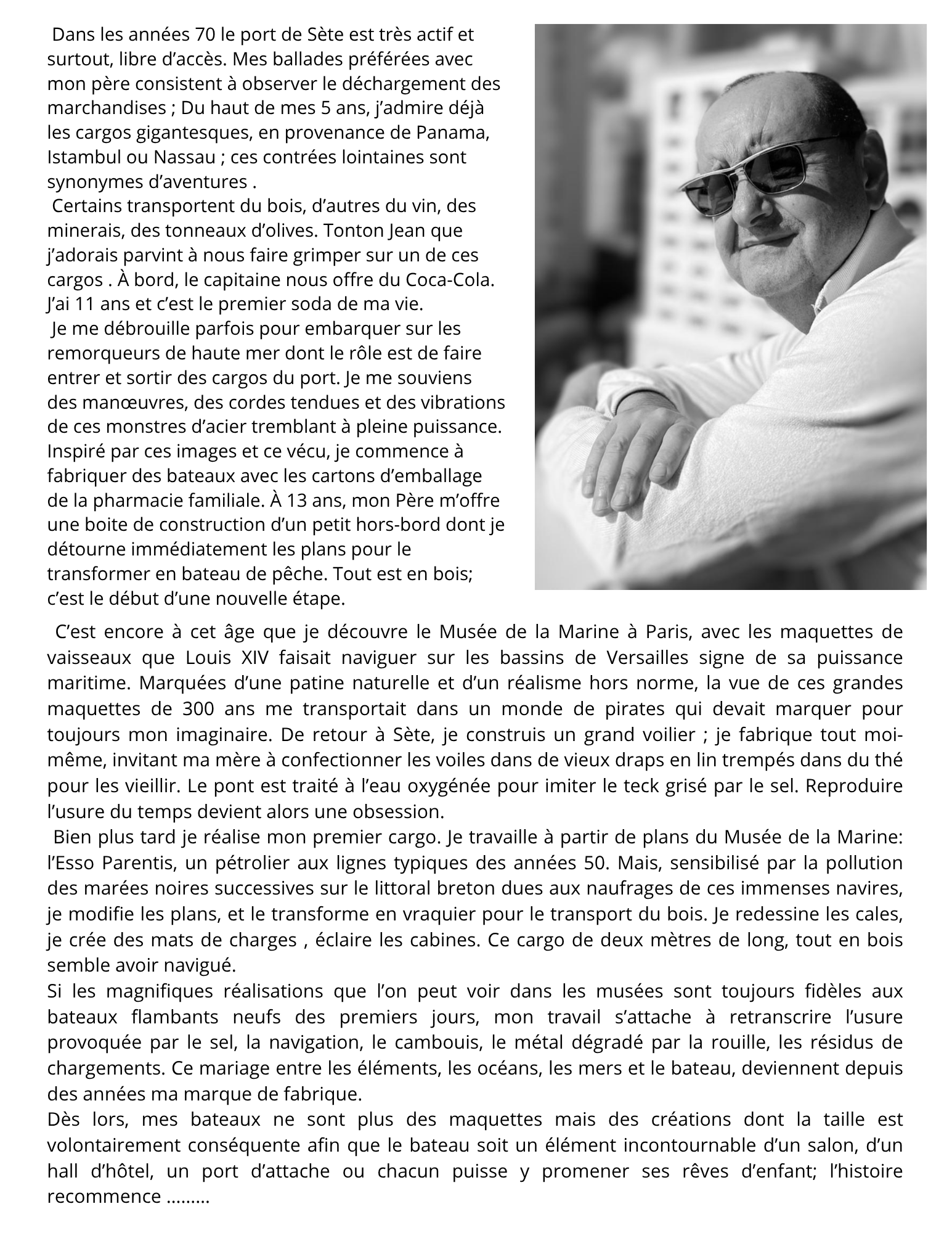 Certains transports du bois, d'autres du vin, des minerais, des tonneaux d'olives. Tonton Jean que j'adorais parvint à nous faire grimper sur un de ces cargos. À bord, le capitaine nous offre du Coca-Cola. J’ai 11 ans et c’est le premier soda de ma vie. Je me débrouille parfois pour embarquer sur les remorqueurs de haute mer dont le rôle est de faire entrer et sortir des cargos du port. Je me souviens des manœuvres, des cordes tendues et des vibrations de ces monstres d’acier tremblant à pleine puissance. Inspiré par ces images et ce vécu, je commence à fabriquer des bateaux avec les cartons d’emballage de la pharmacie familiale. À 13 ans, mon Père m’offre une boite de construction d’un petit hors-bord dont je détourne immédiatement les plans pour le transformer en bateau de pêche. Tout est en bois ; c’est le début d’une nouvelle étape.